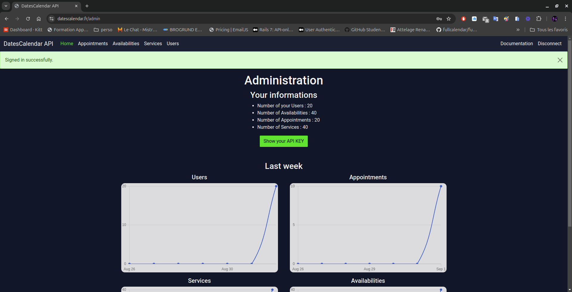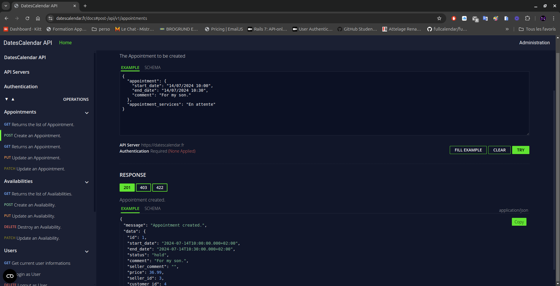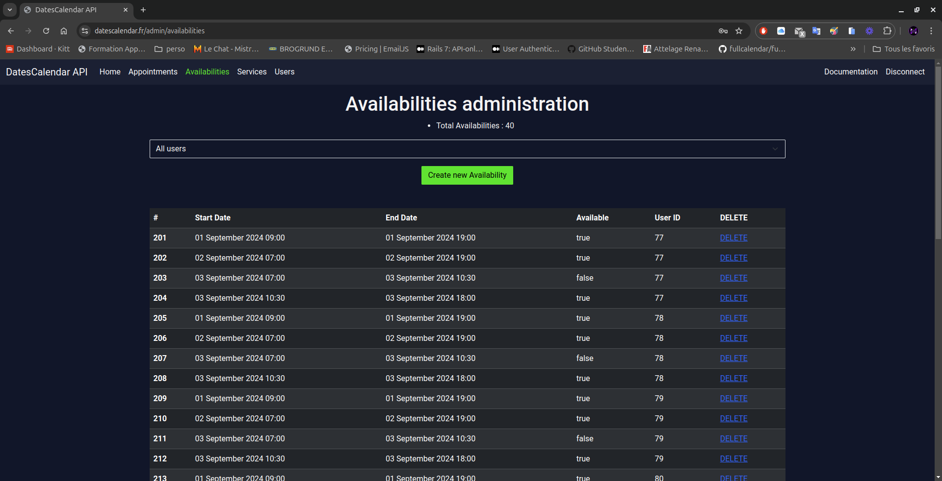 DatesCalendar offre une solution robuste pour la gestion des réservations, exploitant Ruby on Rails et PostgreSQL pour des performances optimales. L'authentification sécurisée via JWT protège l'accès tout en facilitant l'intégration de services, clients et tarifications. Le système gère efficacement les chevauchements d'horaires, assurant une planification fluide. L'utilisation de Stimulus, HTML et CSS améliore l'expérience utilisateur avec une interface intuitive et dynamique.